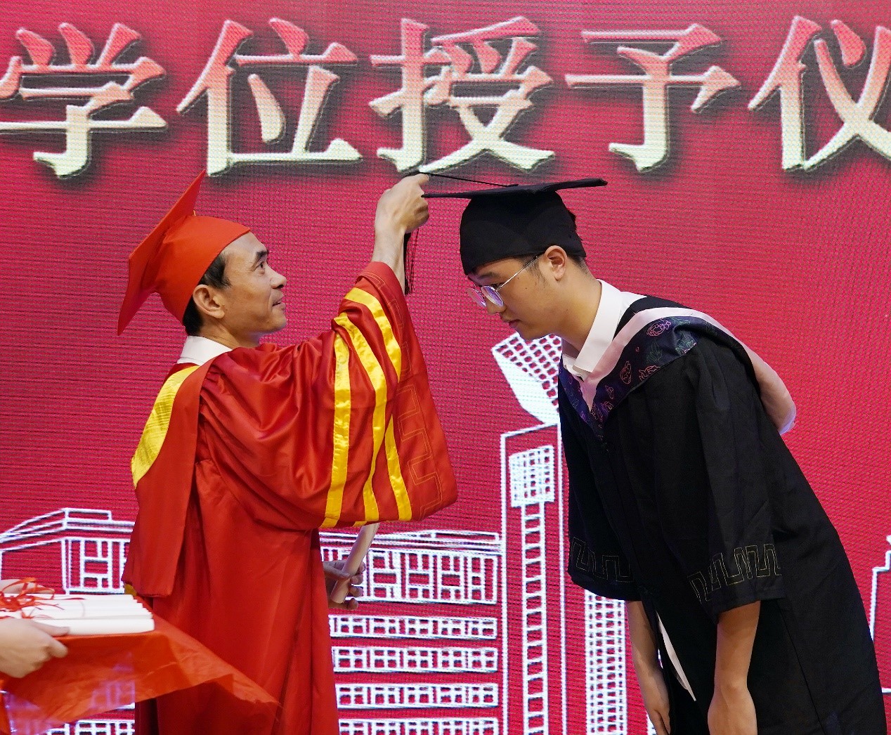 常州大学党委常委、纪委书记邱正祥书记为我院2020届毕业生代表逐一拨正流苏,授予学位,并合影留念。