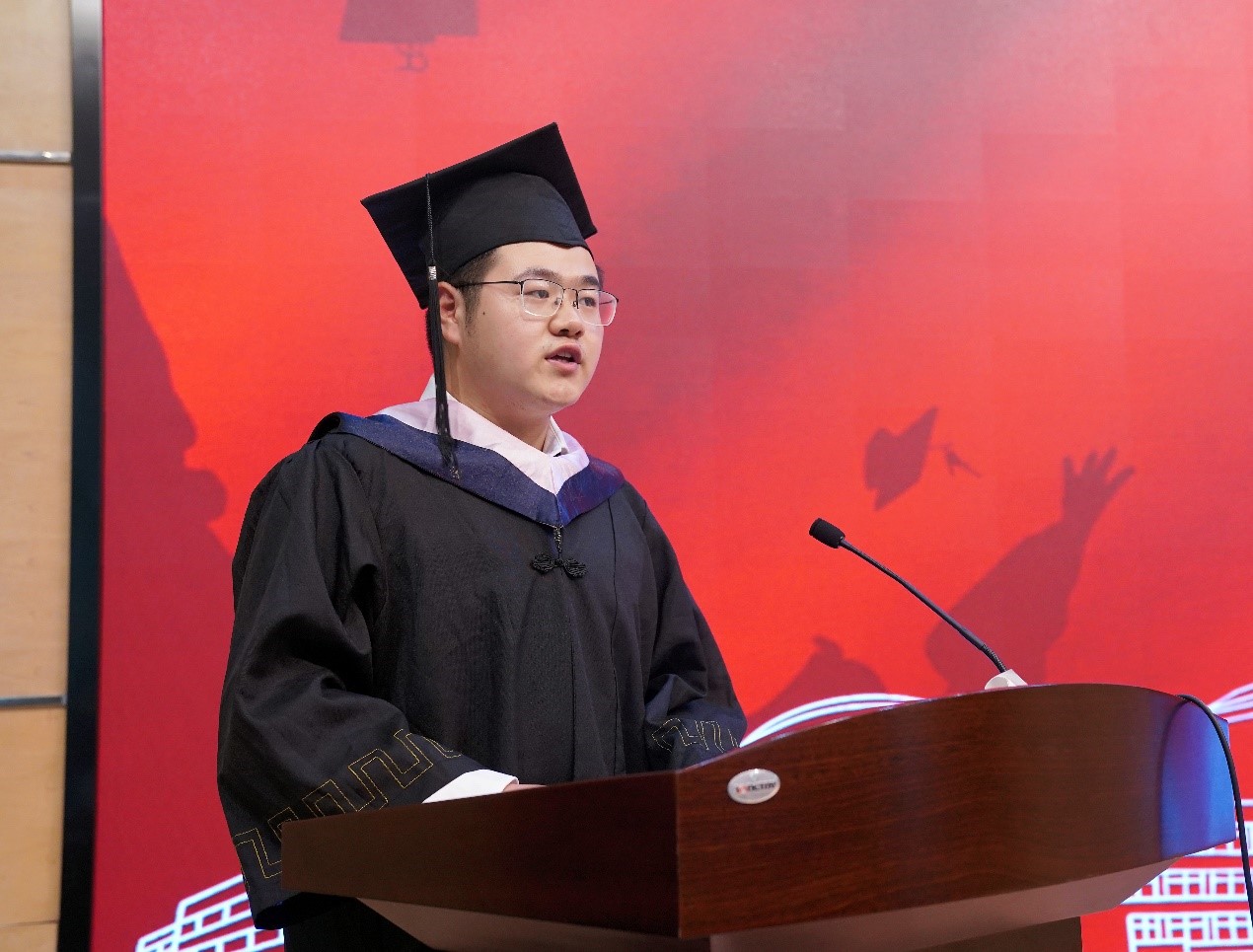 黄卿云同学代表全体本科毕业生们感谢母校的栽培与陪伴,并表示今后无论在哪里,无论做什么,都将谨遵母校的教诲,勇担责任追求卓越,继续填好人生的履历表。同时他也祝福每一位毕业生们不惧前途未知,眼里有光,心中有海。