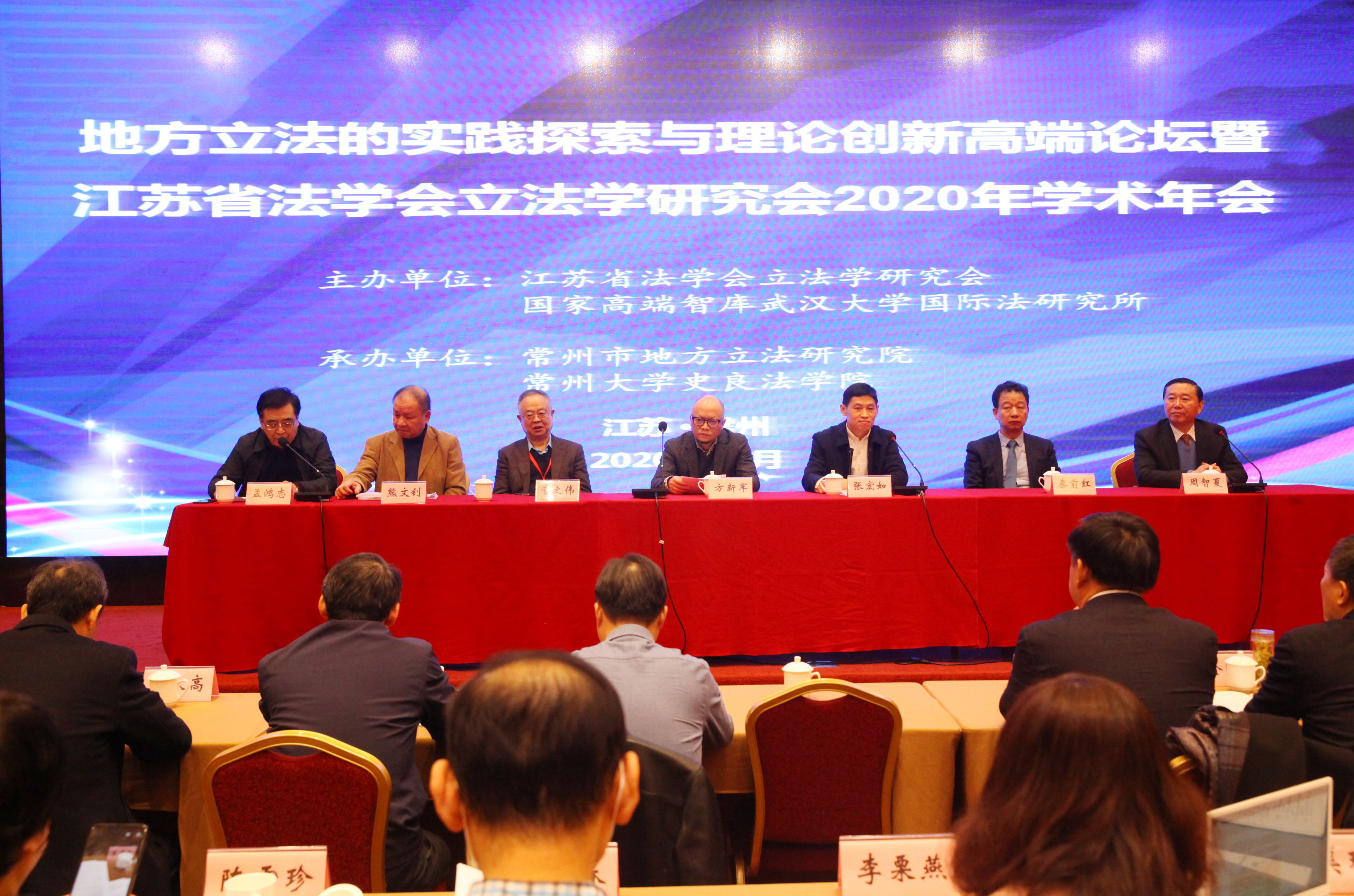 2020年12月12日,由江苏省法学会立法学研究会和国家高端智库武汉大学国际法研究所共同主办,常州市地方立法研究院、常州大学史良法学院承办的地方立法的实践探索与理论创新高端论坛暨江苏省法学会立法学研究会2020年学术年会在美丽的常州隆重召开。本次会议的主题是“地方立法的实践探索与理论创新”。常州大学党委常委、副校长张宏如,江苏省法学会副会长、苏州大学王健法学院院长方新军教授,江苏省人大常委会法工委副主任陈志红,常州市人大常委会法工委主任周智夏,湖北省法学会地方立法研究会会长、国家高端智库武汉大学国际法研究所特聘研究员、教育部长江学者秦前红教授,中国法学会宪法学研究会副会长、华东政法大学童之伟教授,中国法学会立法学研究会副会长、天津大学特聘教授熊文钊教授,江苏省法学会立法学研究会会长、东南大学法学院孟鸿志教授等120余位来自各高校代表以及江苏省人大常委会、政府机关、法院、检察院、律师界代表齐聚常州,共话地方立法理论与实践的重要议题。会议开幕式由孟鸿志教授主持。