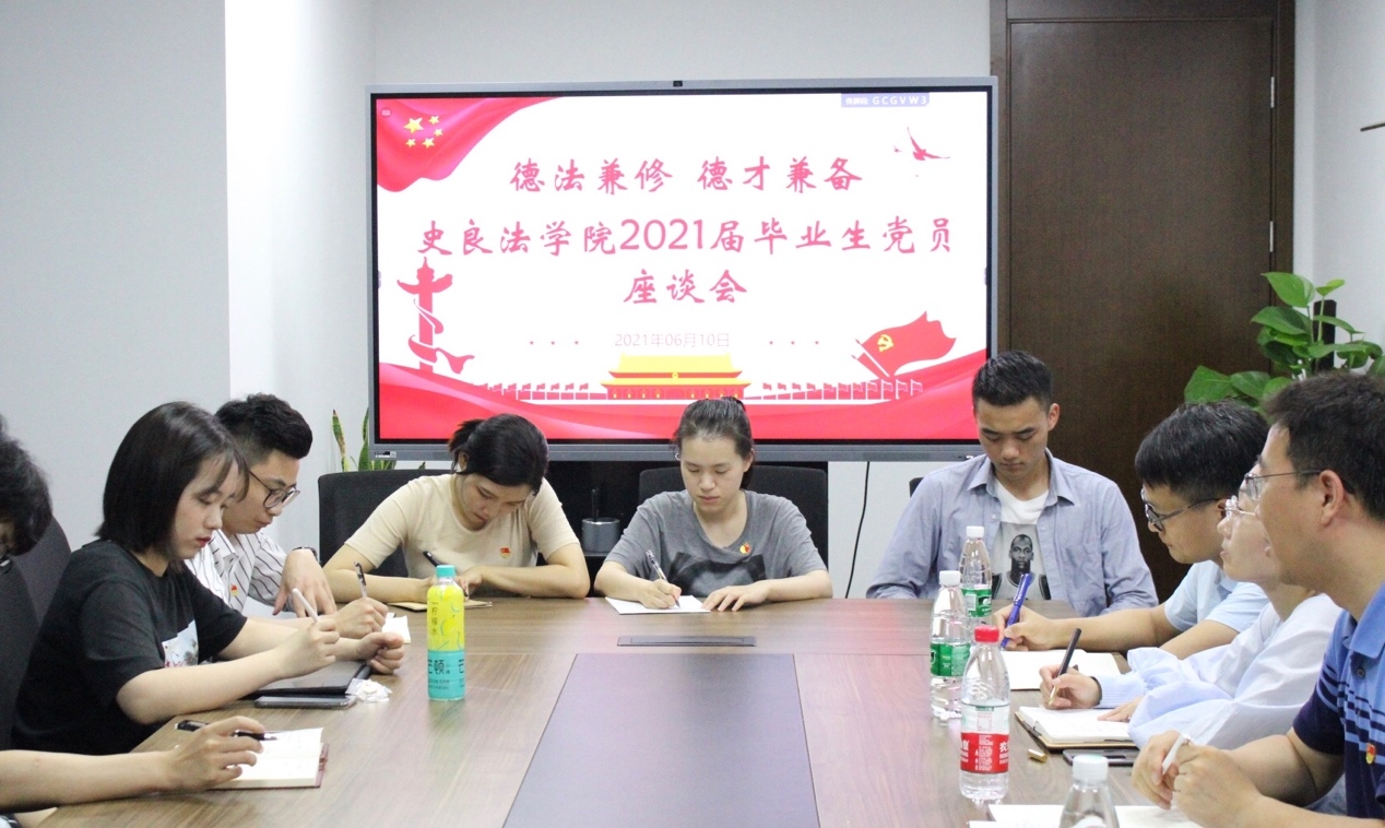 6月10日下午两点,史良法学院于立德楼355办公室召开2021届毕业生党员座谈会。本次座谈会由史良法学院辅导员陈子威主持,史良法学院党委书记秦义、副书记陈婷及辅导员陈慧香参会。