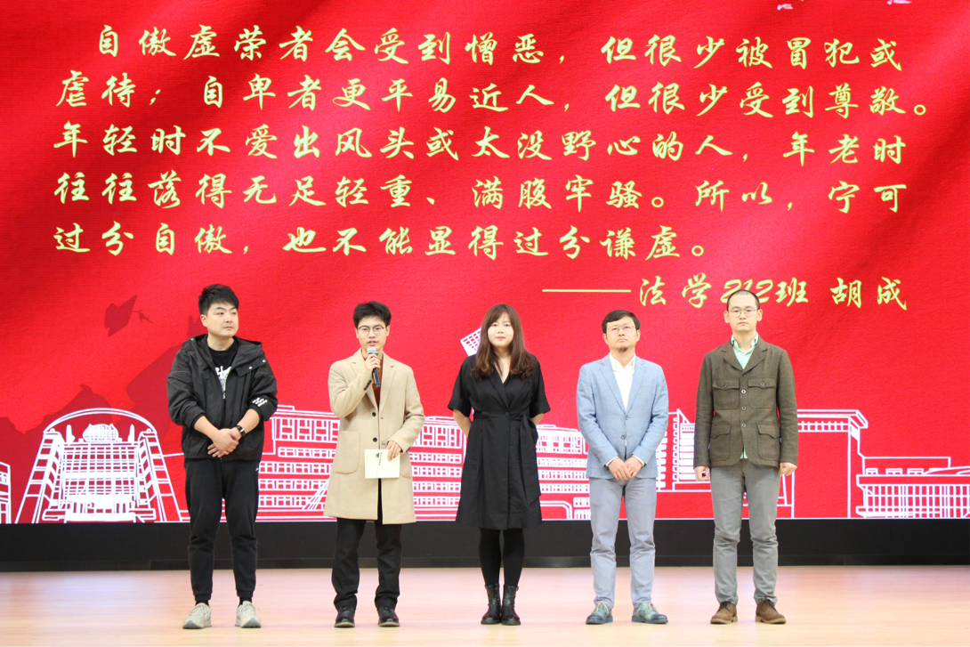 常州大学青果卓越成长基金获得者,本科生新生陈浩明,常州大学优秀毕业生标兵,研究生新生房燕分别代表本科生和研究生发言。五位新生班主任对全体新生送上寄语,老师们分别阐释了作为法学生应有的素质与理想,对大家提出了“当有傲骨不屈膝,当独立自强不从众,当充实生活不虚度,当广泛涉猎拓视野”的期望。