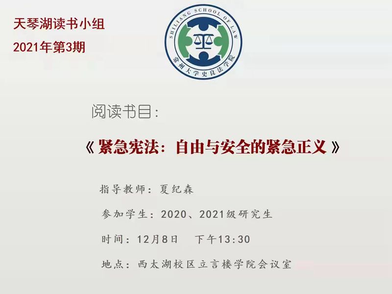 12月7日上午9:00,天琴湖读书小组2021年第3期读书活动在常州大学西太湖校区立言楼史良法学院会议室顺利举行。本次读书会的阅读书目为滕宏庆教授所著《紧急宪法:自由与安全的紧急正义》。读书会由夏纪森老师、周忠学老师指导,法学2020级、2021级等10余位研究生参与了讨论。