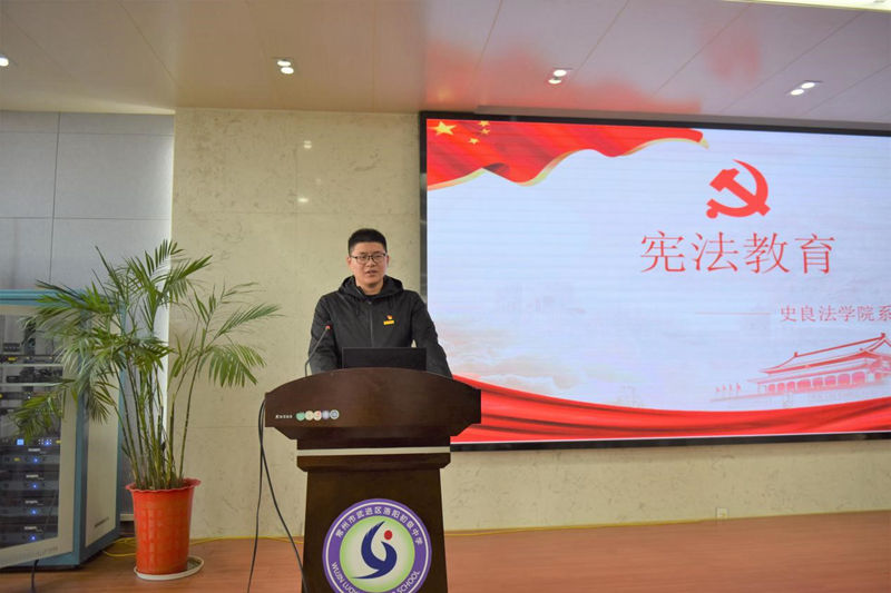 史良法学院研究生代表张凌岱进行宪法授课。他从"双减"政策与受教育权等案例展开,论述了宪法的内容、宪法日的来历和法治的重要性。张凌岱强调,宪法是我国的根本大法,是国家法治建设的核心,同学们应自觉遵守宪法和法律,自觉维护宪法尊严。
