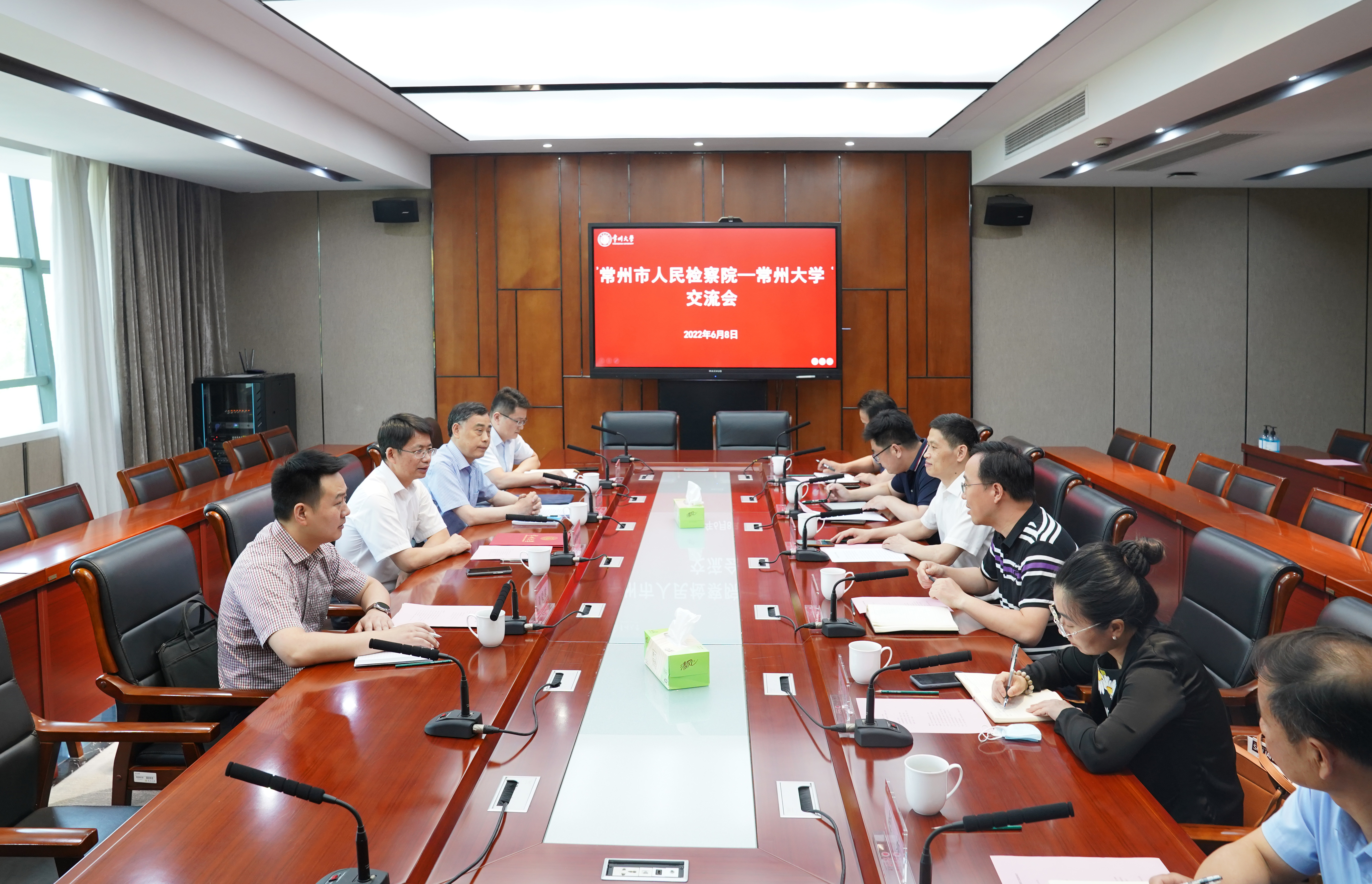 6月8日上午,常州市人民检察院党组书记、检察长陈兴生,市检察院党组成员、副检察长王建国等一行来校开展合作交流。党委常委、纪委书记邱正祥,党委常委、副校长张宏如,史良法学院党委书记秦义,副书记陈婷,副院长张建、莫良元,刑法所所长赵赤出席交流会。