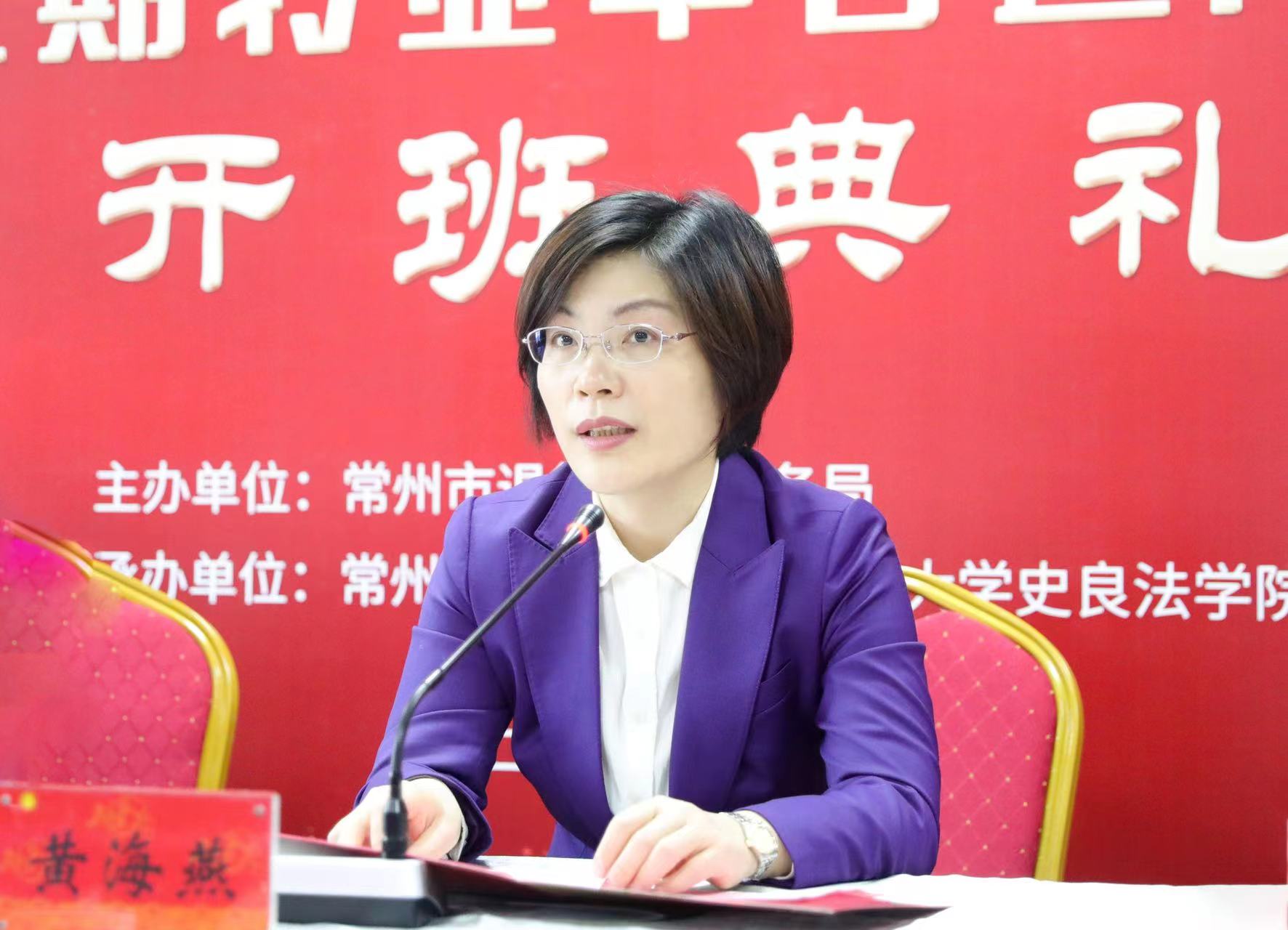 黄海燕致欢迎辞。她代表学校欢迎各位学员加入常州大学大家庭,简要介绍我校办学情况,并指出,借此培训契机将有利于进一步搭建我校与各单位的合作平台。同时,学校也将统筹部门和学院多方力量,努力做好培训期间各项服务与保障工作。通过以法学专业为主干课程的渗透,依托学校优质师资力量,做到理论学习与实践学习相结合,让各位学员能够学有所思、学有所悟、学有所获、学以致用,提升专业技能和履职能力,确保培训取得理想的成效。