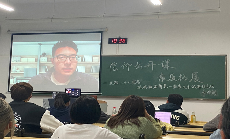 张桐珲博士以时间为线,从中国历史发展的角度,用理论联系实际的方法,以革命叙事史观与现代化叙事史观为统领,带领同学们从文献中探寻中国式现代化从建国初至今不断成型的发展历程。张博士寄语学生们:把握好大学四年,做中国式现代化的实践者、中华民族伟大复兴的推动者与见证者!