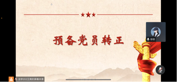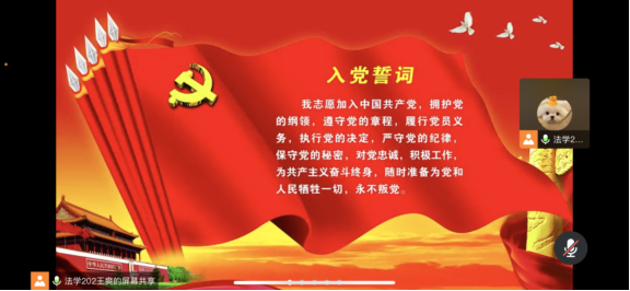 12月28日下午,史良法学院本科生党支部大会于线上举行。会议由本科生党支部学生党员王爽主持,党支部全体党员及发展党员参与此次大会。会议共分为三项议程,一是对尚函羽等8位同志的入党问题进行讨论和表决,二是对许陆玥等8位预备党员的转正问题进行讨论和表决,三是由8位中共预备党员进行入党宣誓。
