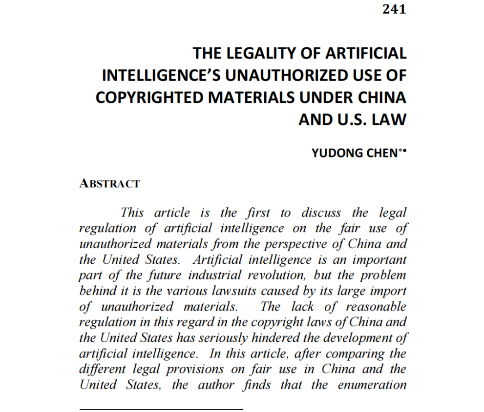 近日,我院2020级硕士研究生陈鈺栋以独立作者身份在美国期刊《The Law Review of the Franklin Pierce Center for IP》(IDEA)发表了题为《THE LEGALITY OF ARTIFICIAL INTELLIGENCE’S UNAUTHORIZED USE OF COPYRIGHTED MATERIALS UNDER CHINA AND U.S. LAW》的研究论文。这是我院在读硕士生发表的第一篇英文作品,体现了我院人才培养质量和科研水平的不断提高。