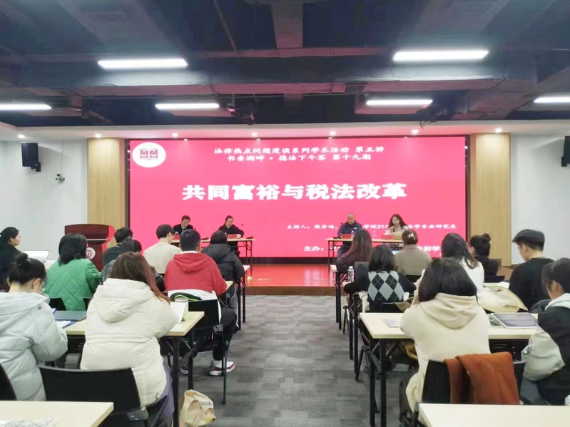 3月1日晚,我院法律热点问题漫谈系列学术活动第五讲“共同富裕与税法改革”,在常州大学西太湖校区立言楼458会议室顺利举行。本次活动由唐步龙老师、李俊英老师、杨大春老师三位老师担任主讲人,由2021级财税法学专业研究生熊丹培主持,夏纪森副院长、卫乐乐等老师以及史良法学院30余位研究生参加了本次活动。