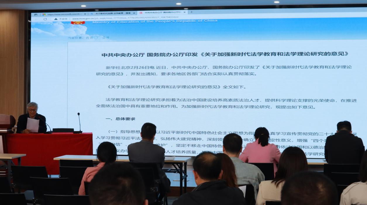 为深入学习贯彻中共中央办公厅、国务院办公厅印发的《关于加强新时代法学教育和法学理论研究的意见》(以下简称为《意见》),史良法学院于3月15日下午在立言楼458举行加强新时代法学教育和法学理论研究的专题学习会,对贯彻落实《意见》精神展开集中研讨。会议由我院名誉院长曹义孙领学,我院全体教职工参加。