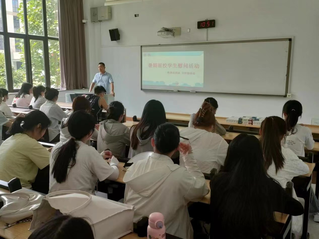 王禄佳代表学院向留校同学表达了细致入微的关心和贴心真诚的叮嘱,他亲切地询问了同学们近期的学习计划和生活情况,希望同学们在考研、考公、法考复习的关键阶段要合理制定目标,做好规划;充分利用好暑假黄金期,拿出“衣带渐宽终不悔,为伊消得人憔悴”的精神状态全身心投入到备考中。同时,要注意劳逸结合,积极锻炼,调整好自己的心态和身体状态。并且提醒同学们留校期间要严格遵守学校的各项规定,树立安全意识。最后,学院还为留校学生准备了慰问品,在这个炎热的夏天为同学们送去一份清凉。