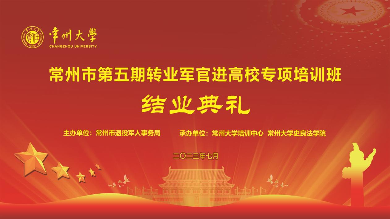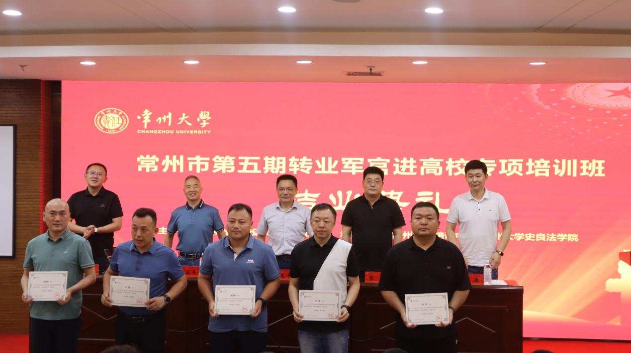 7月7日下午,由常州市退役军人事务局主办,常州大学培训中心、史良法学院承办的常州市第五期转业军官进高校专项培训结业典礼在我校图书馆报告厅举行。市退役军人事务局副局长尹志平,市退役军人事务局移交安置处处长蒋磊,常州大学继续教育学院院长、培训中心主任荆谷平、常州大学史良法学院院长张建参加结业典礼,典礼由常州大学继续教育学院副院长彭小建主持。