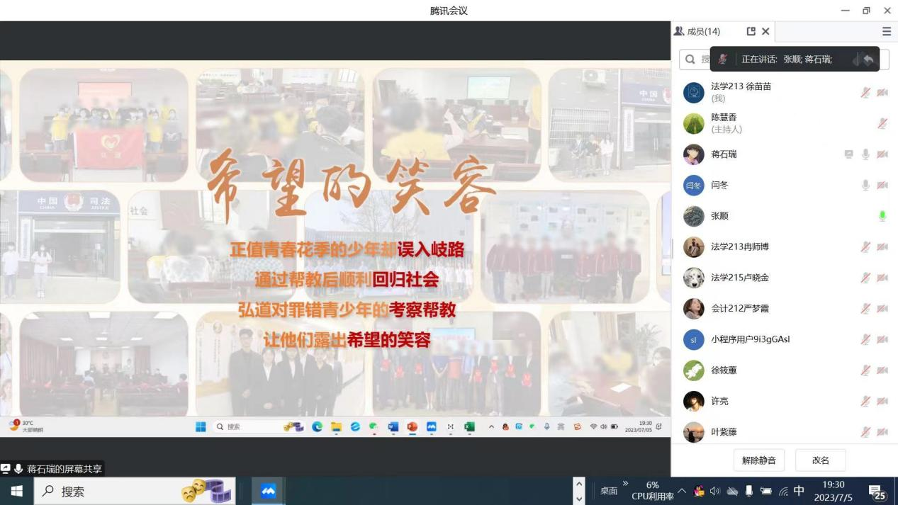 会议伊始,团队主要成员蒋石瑞就弘道项目的暑期计划与未来规划进行汇报,参会老师分别发表建议。作为弘道项目的第一指导老师张顺向新成员们介绍了弘道发展的历史以及往期比赛经验,让他们对弘道项目有了一个更加全面且具体的了解。同时就项目存在的细节问题,提出了模式构建与项目背景等方面的建议,并表达了对项目的期望与展望。闫冬就团队与阳光机构的合作方案PPT中存在的问题提供了实务上的指导。陈慧香从比赛方面和法治研学营两方面对团队进行了指导,希望同学们提高自我要求,从文本撰写、PPT制作与修改、答辩等方面全面提高个人能力。