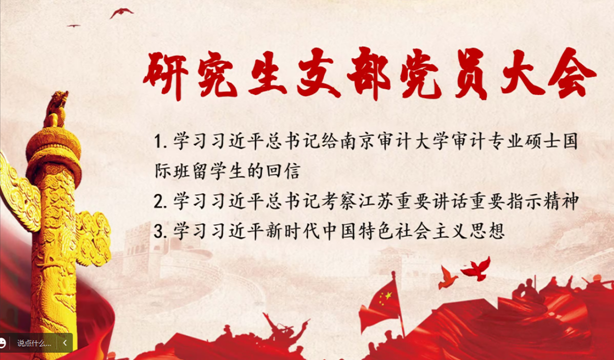 会上,主要学习了《习近平新时代中国特色社会主义思想专题摘编》第二章、习近平总书记考察江苏重要讲话重要指示精神和习近平总书记给南京审计大学审计专业硕士国际班留学生的回信。