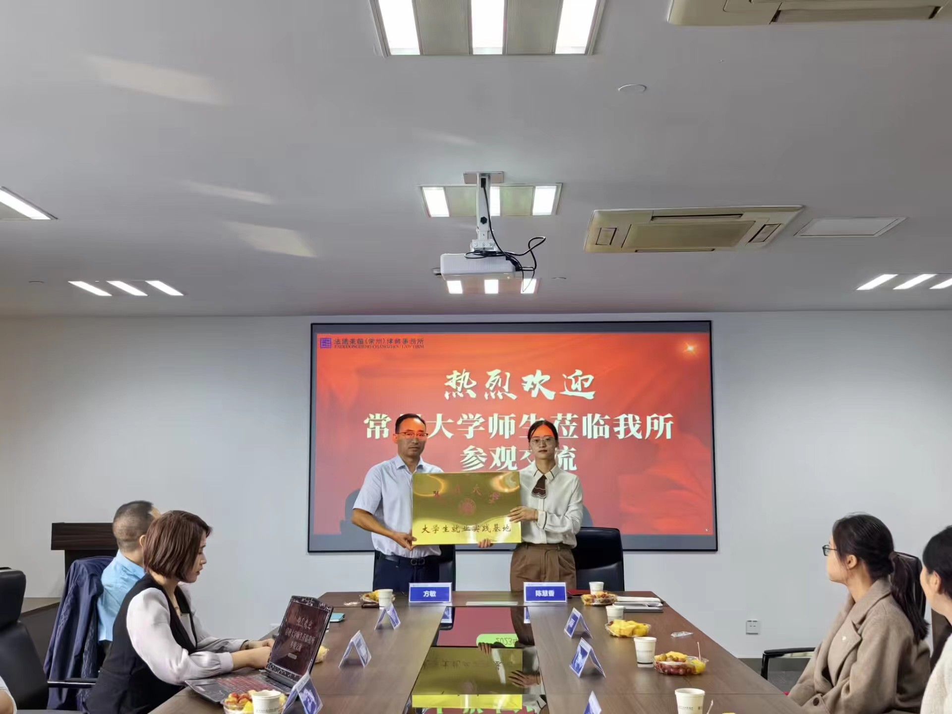 交流会上,王禄佳书记和辅导员陈慧香代表学院和律所负责人签订“就业实践基地协议”、颁发“大学生就业实践基地”证书。王禄佳书记表示,希望双方能够互相成就,本院学子可以借助就业实践基地平台,为今后的成长发展提供有力的支持,同时也能为两家律所注入优质的新鲜血液,实现校企共建的合作目标。