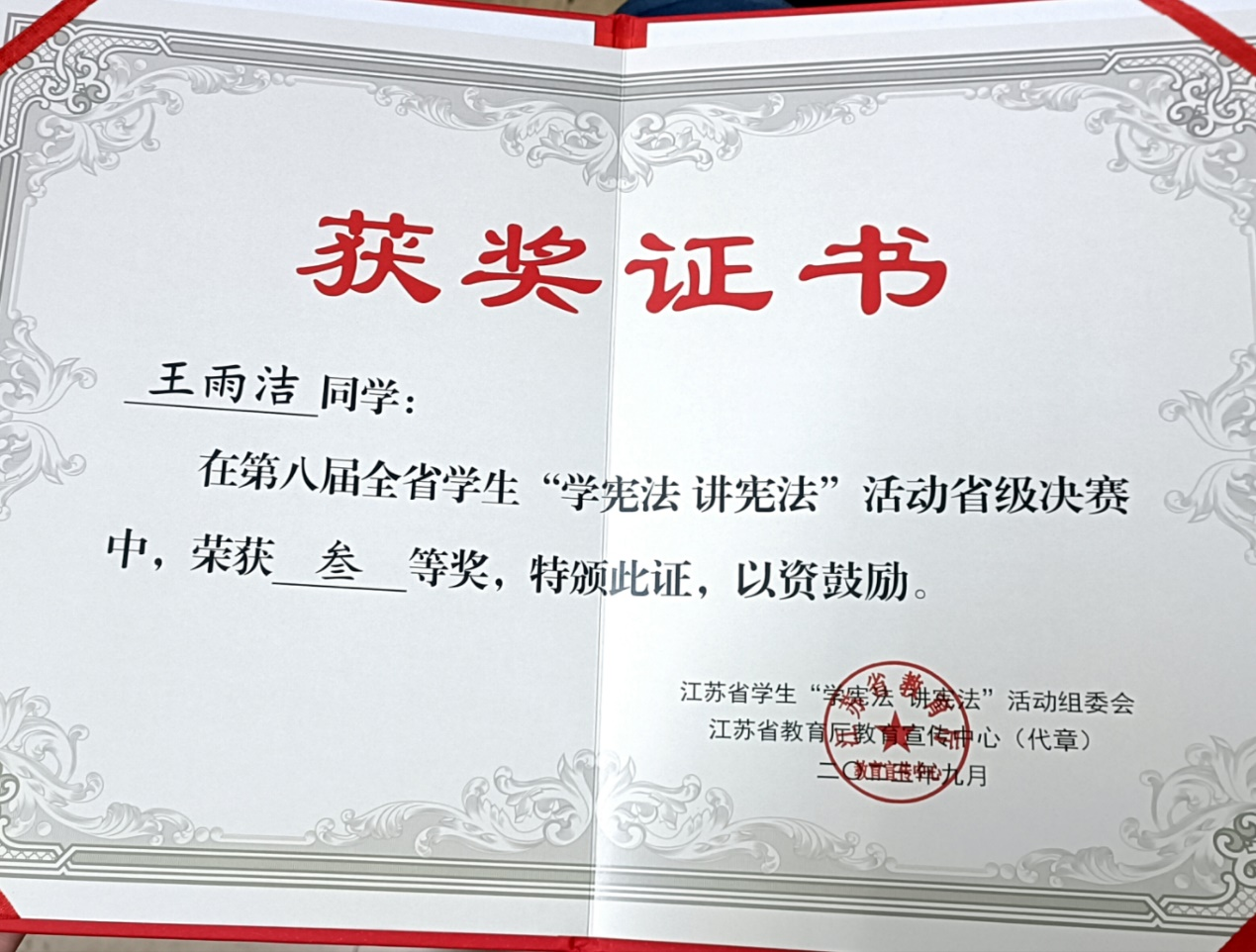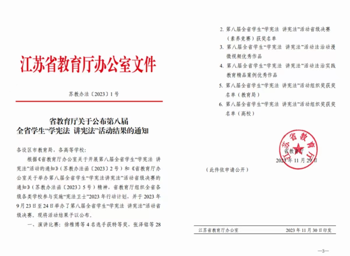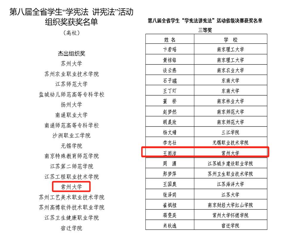 近日,由江苏省教育厅、江苏省司法厅主办的第八届全省学生“学宪法 讲宪法”活动公布评审结果,史良法学院2021级学生王雨洁荣获(素养竞赛)三等奖,常州大学荣获 “杰出组织奖”。
