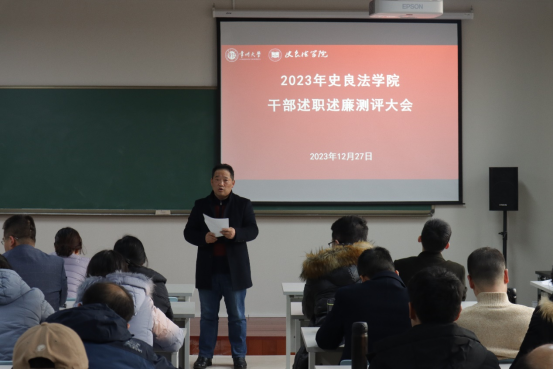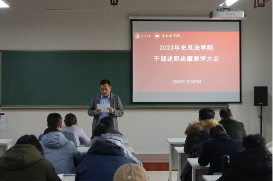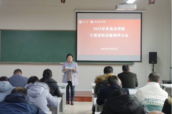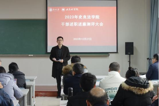2023年12月27日下午,我院在立言楼342召开2023年度处级干部述职述廉测评大会。常州大学纪委副书记陆恒,校办蒋梦颖老师,史良法学院全体教职工参加会议。会议由陆恒主持。党委书记陈婷、院长张建、中国财税法治战略研究院执行院长梁文永、党委副书记王禄佳、副院长莫良元、副院长夏纪森依次述职述廉。