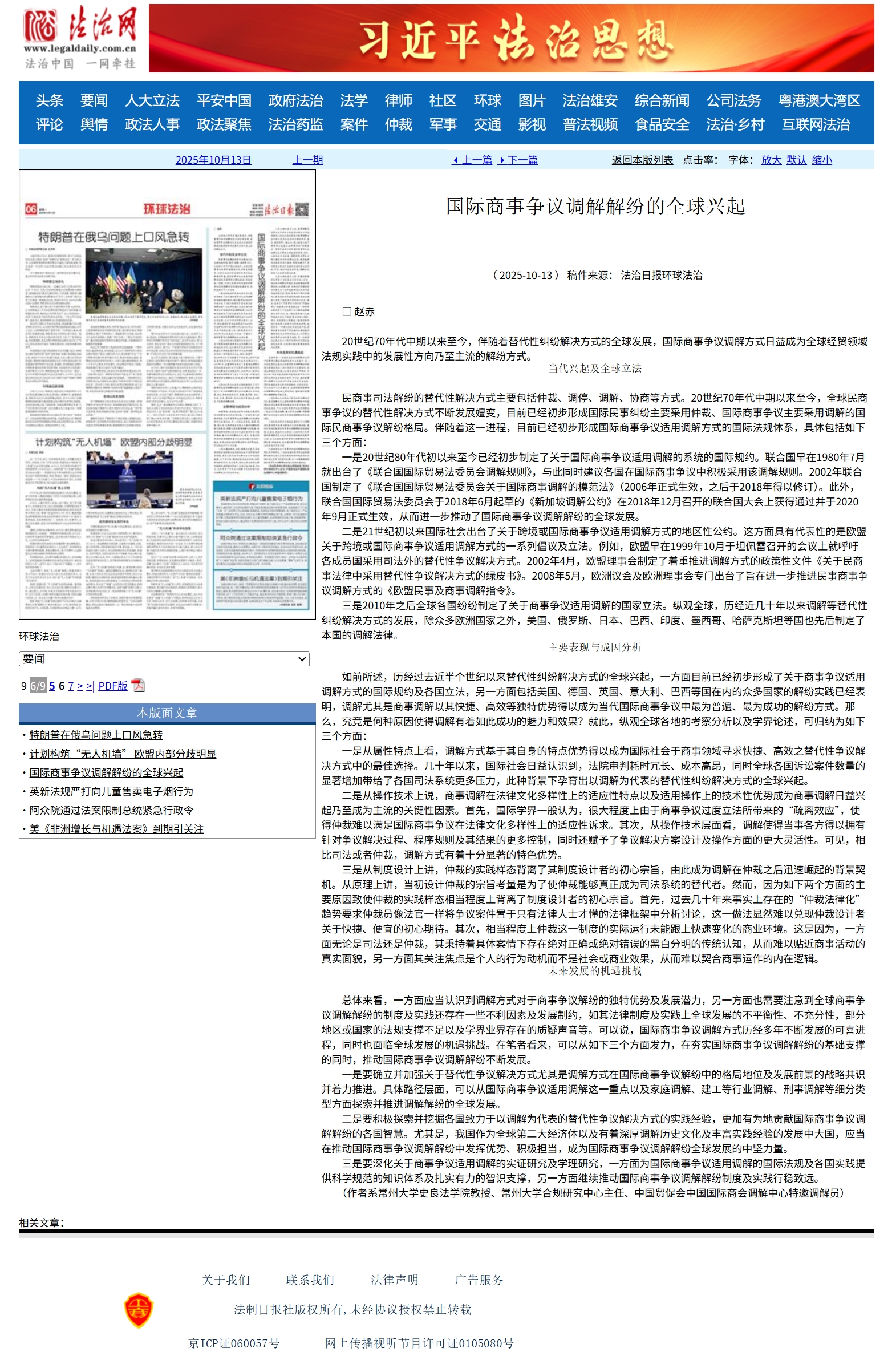 赵赤教授在《法治日报》发表“国际商事争议调解解纷的全球兴起”