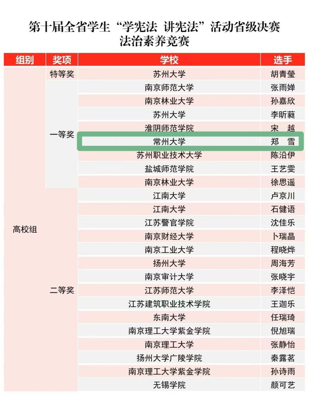 近日,由江苏省教育厅主办的第十届全省学生“学宪法 讲宪法”活动省级决赛圆满收官。经过激烈角逐,我院2023级学生郑雪凭借扎实的法律知识功底,荣获高校组法治素养竞赛一等奖。