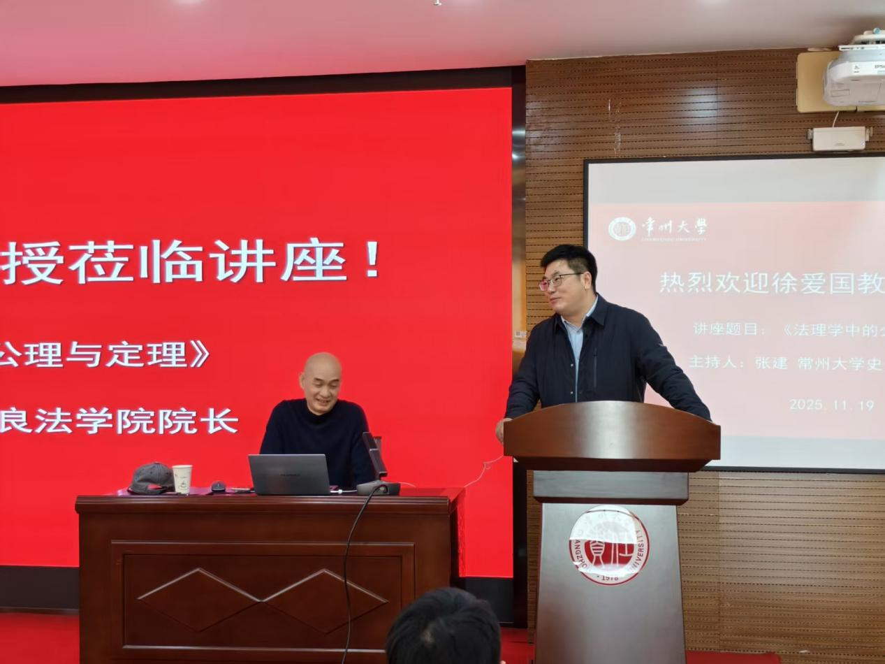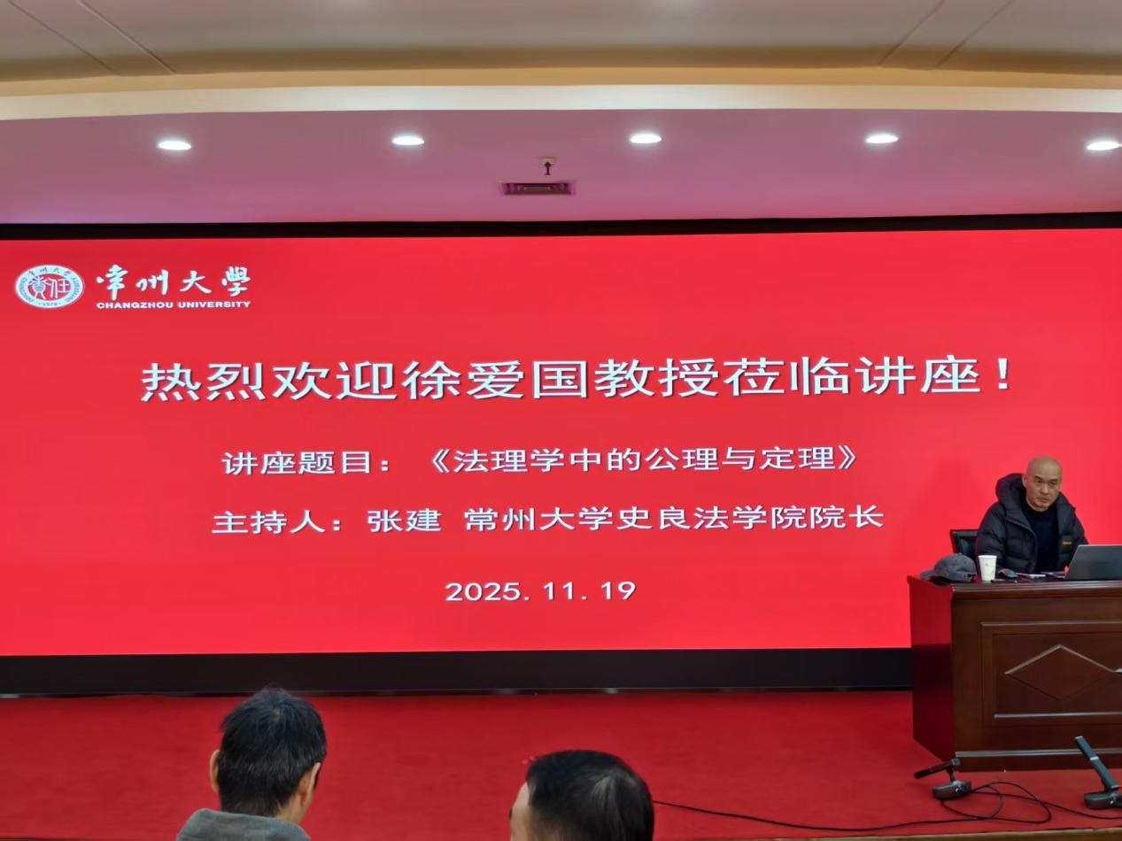 2025年11月19日下午,我院邀请北京大学法学院教授、博士生导师徐爱国在科教城校区图书馆报告厅603室开展了一场主题为《法理学中的公理与定理》的精彩讲座。本次讲座由常州大学史良法学院院长张建主持,学院部分教师、研究生和本科生参加。