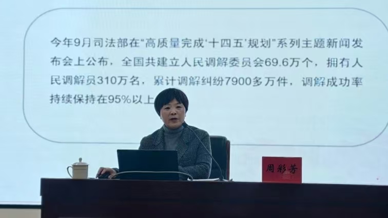 此次培训紧紧围绕基层家事调解工作实际需求展开。我院高可副教授,作为深耕婚姻家庭调解领域的专家,以婚姻关系、亲子关系、继承关系等家庭常见纠纷为核心,“系统解读了婚姻家庭领域最新法律规定、前沿理论热点”,并“结合典型案例拆解法理逻辑”,其专业讲解有效助力了参训人员夯实法治素养根基。