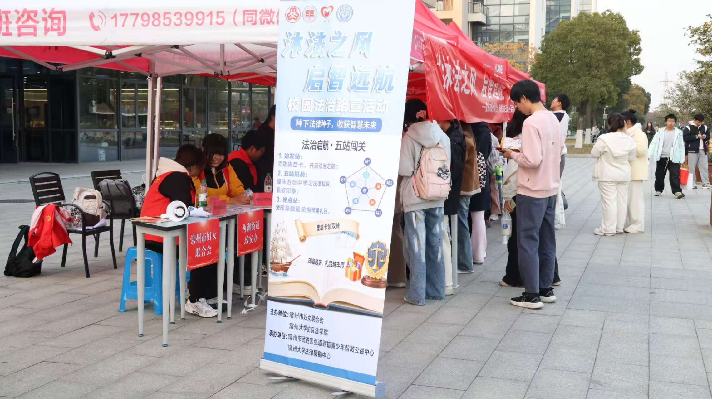 为深入推进校园法治宣传教育工作,切实提升师生法治意识与自我保护能力,营造“学法明礼、守法笃行” 的校园氛围,12月1日上午十时至下午十七时,由常州市妇女联合会、西太湖街道政安办与常州大学史良法学院联合举办的校园法治路宣活动在常州大学一食堂门口顺利开展。本次活动吸引众多在校学生参与,史良法学院辅导员唐亚岚到场进行指导。