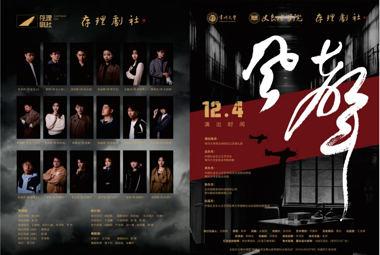 为纪念中国人民抗日战争暨世界反法西斯战争胜利80周年,贯彻落实《中华人民共和国法治宣传教育法》,常州大学史良法学院存理剧社于12月4日晚18点30至21点30在校内大礼堂举行了法治话剧《风声》公演。本次活动作为我院法治文化节主要活动之一与法治文化建设、思政育人的重要实践环节,立足“第二课堂”育人视角,对提升学生法治意识与制度自觉、丰富法学人才培养模式具有积极示范意义。