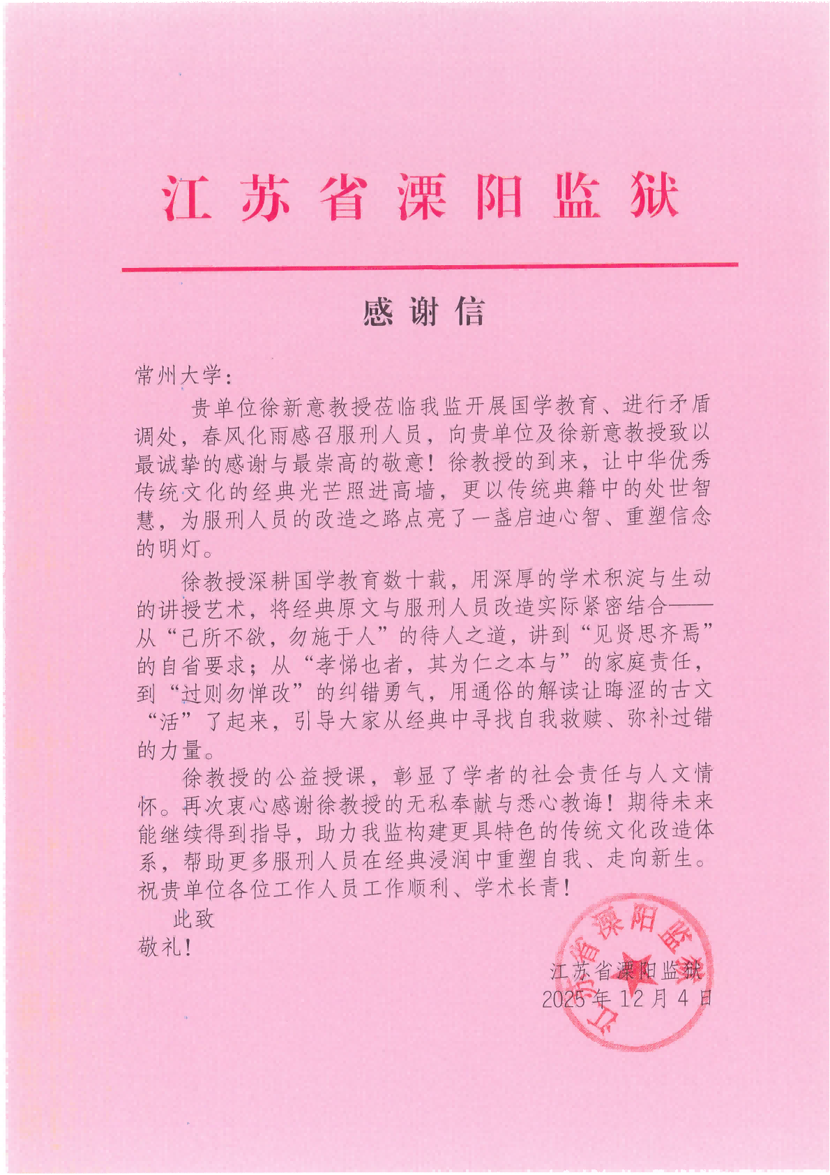 近日,江苏省溧阳监狱向常州大学发来感谢信,对我院徐新意老师深入监狱系统开展国学教育与矛盾调处工作表示高度赞誉。信中特别指出,徐老师通过生动的国学课程,将中华经典智慧融入服刑人员教育改造,为其“点亮了一盏启迪心智、重塑信念的明灯”。