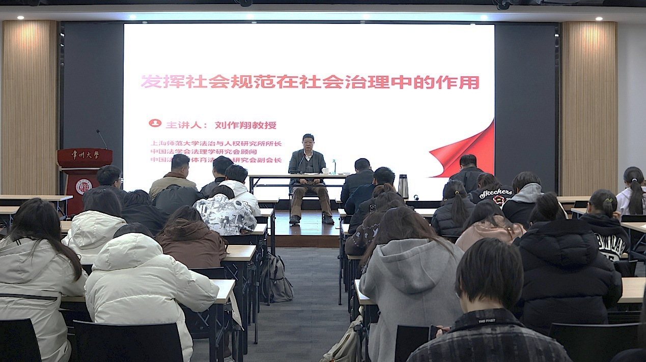 为深化法学专业学生对法治社会建设的理论认识,拓展学术研究视野,3月23日晚,史良法学院于西太湖校区立言楼458举办“发挥社会规范在社会治理中的作用”学术讲座。本次讲座由上海师范大学法治与人权研究所所长、中国法学会法理学研究会顾问刘作翔教授主讲,史良法学院院长张建主持,学院法学专业24级全体本科生参加。 张建首先向在场学生介绍了刘作翔教授的学术成就与研究领域,指出本次讲座主题紧贴法治社会建设前沿,对同学们的专业学习具有重要指导意义。刘作翔结合党的二十届三中全会、党的二十大报告等中央文件,围绕法治社会建设的政策背景与社会规范内涵展开讲解,深入阐释了“社会法治建设”在全面依法治国中的定位,强调社会规范建设是推进依法治理的重要抓手。他还结合典型案例,厘清了法律规范与社会规范的边界,指出社会规范虽无国家强制力,但必须契合法治精神,这是实现社会自我约束的重要补充。讲座最后,刘作翔与在场学生进行了互动交流。 本次讲座内容翔实、逻辑清晰,为师生们搭建了专业交流的平台,进一步拓宽了同学们的学术视野,深化了对社会规范与法治社会建设内在关联的理解,为今后的专业学习与研究实践提供了有益启发。(通讯员/毛安竹 审核/王禄佳)