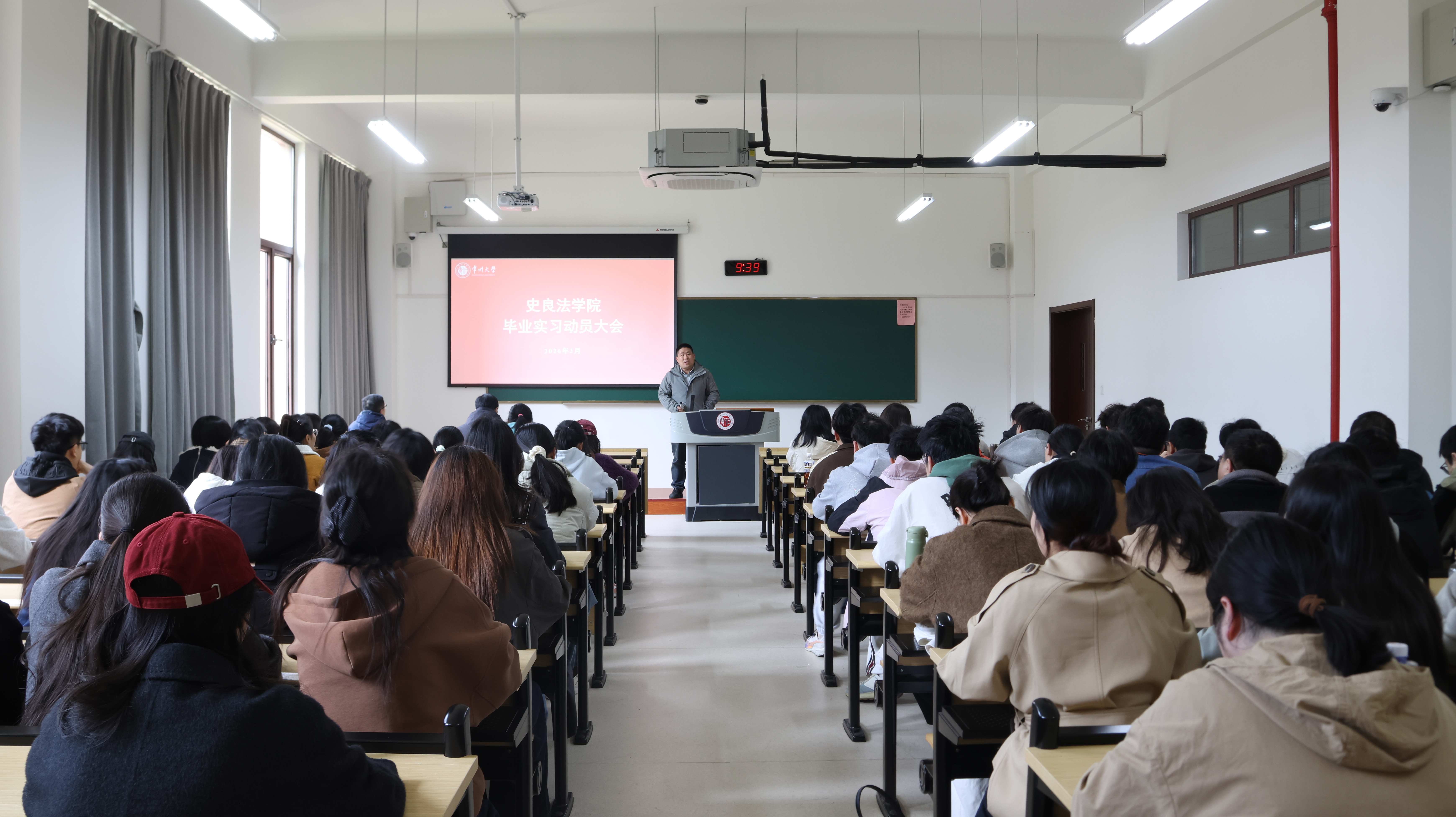 为扎实推进2026届本科毕业生实习工作,确保实习安全与质量,2026年3月27日上午,史良法学院于立功楼129教室召开2026届本科毕业生实习动员大会。学院党委副书记王禄佳、学院副院长张顺、本科教务秘书赵东、毕业班辅导员徐耀飞出席会议,全体2026届本科毕业生参加。 会上,王禄佳指出法院、检察院实习是法学理论对接法律实践的重要桥梁,要求同学们虚心向学、严守工作纪律与保密规定,高度重视人身安全与职业边界。他强调,实习既是检验学习成果的契机,也是明确职业方向的窗口,鼓励同学们结合实习经历积极择业,在实践中发现并把握发展机遇。随后,张顺围绕毕业实习的各项关键工作作出全面部署与重点强调,从团队管理、日常规范、纪律要求、安全防范等方面为同学们顺利开展实习指明方向,筑牢实习工作的规范根基。他还现场逐一解答了同学们提出的其他实习相关问题,及时释疑纾困,确保各项安排清晰明确、落实到位。 此次动员大会进一步明确了实习纪律与工作要求,为毕业生有序开展实习奠定了坚实基础,引导同学们以严谨务实的姿态深耕岗位、锤炼专业本领,夯实长远职业发展根基。(通讯员/毛安竹 审核/王禄佳)