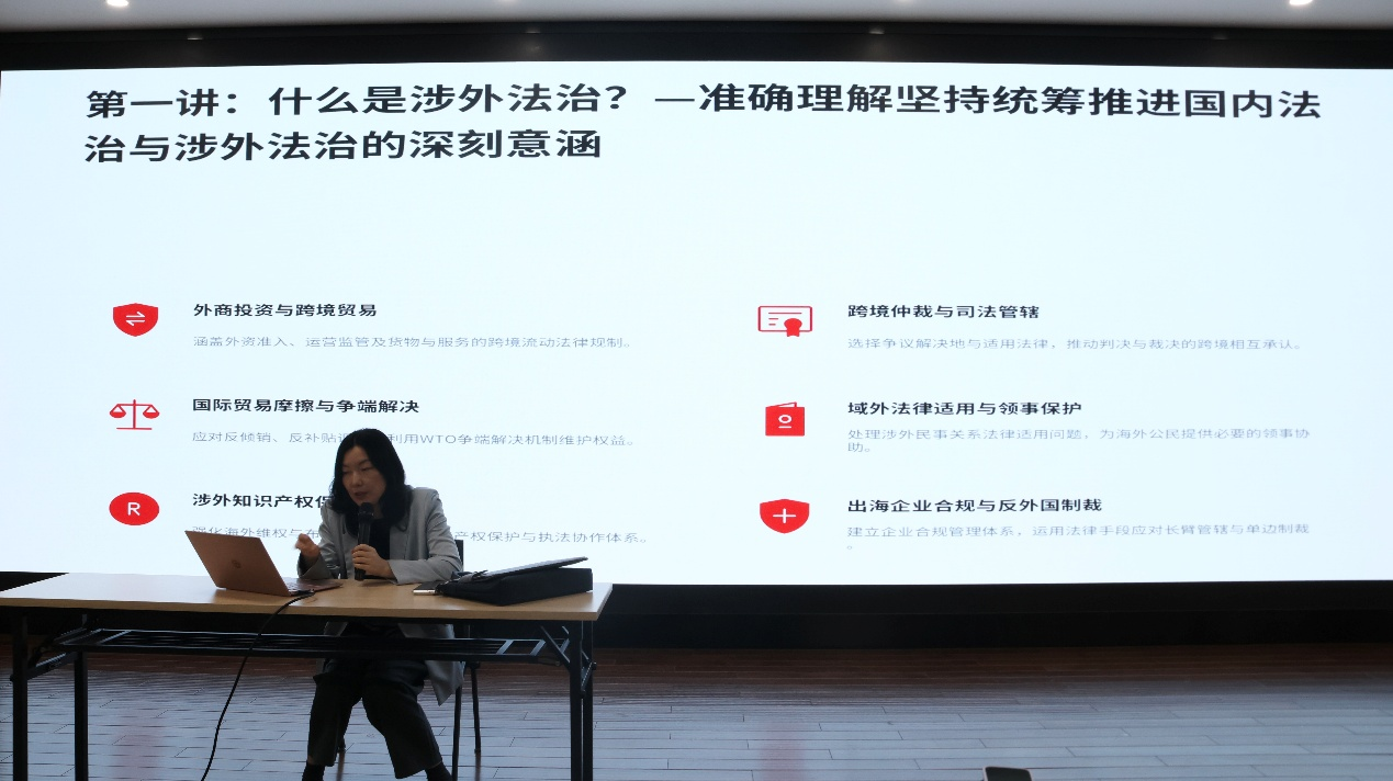 讲座中,张浩庭长系统讲解了涉外法治相关知识与人才发展要求。她阐释了涉外法治的核心定义,明确了涉外法治人才必备的五大核心素养,即扎实的法律功底、过硬的外语能力、成熟的国际规则认知、深厚的家国情怀与复合型综合视野。张浩庭长重点强调了法律英语的重要性,其是外文文书处理、跨境沟通、涉外庭审工作的必备能力。结合行业人才缺口现状,她为同学们给出学业提升建议,鼓励大家夯实专业基础、精进法律英语、积累涉外实践经验,并介绍了涉外司法、涉外律师、涉外企业法务等多元就业方向。