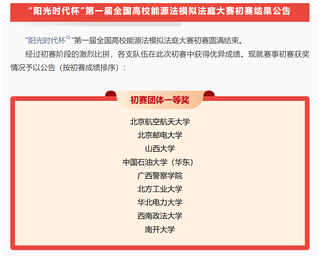2026年4月,“阳光时代杯”第一届全国高校能源法模拟法庭大赛初赛圆满落幕。我院参赛队伍在赛事中表现优异,从全国众多参赛队伍中脱颖而出,荣获初赛二等奖,充分彰显了我院学子在能源法领域扎实的专业分析能力与严谨的逻辑论证能力。