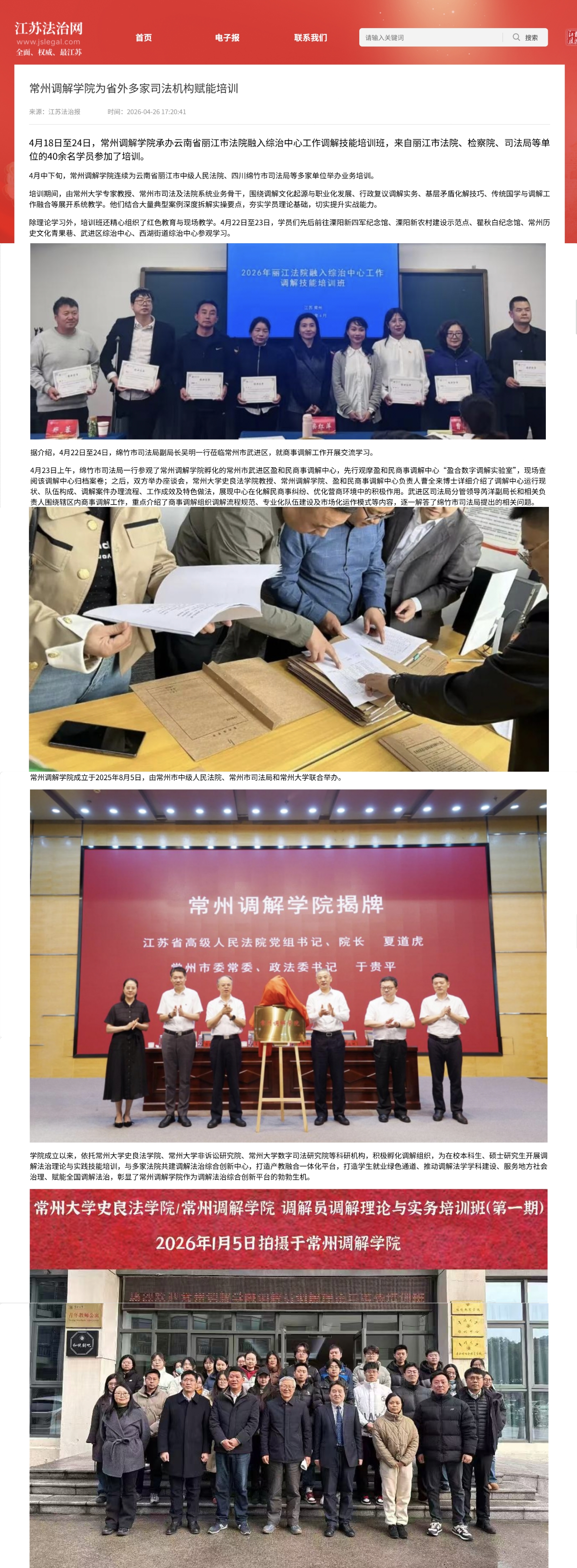 学院成立以来,依托常州大学史良法学院、常州大学非诉讼研究院、常州大学数字司法研究院等科研机构,积极孵化调解组织,为在校本科生、硕士研究生开展调解法治理论与实践技能培训,与多家法院共建调解法治综合创新中心,打造产教融合一体化平台,打造学生就业绿色通道、推动调解法学学科建设、服务地方社会治理、赋能全国调解法治,彰显了常州调解学院作为调解法治综合创新平台的勃勃生机。